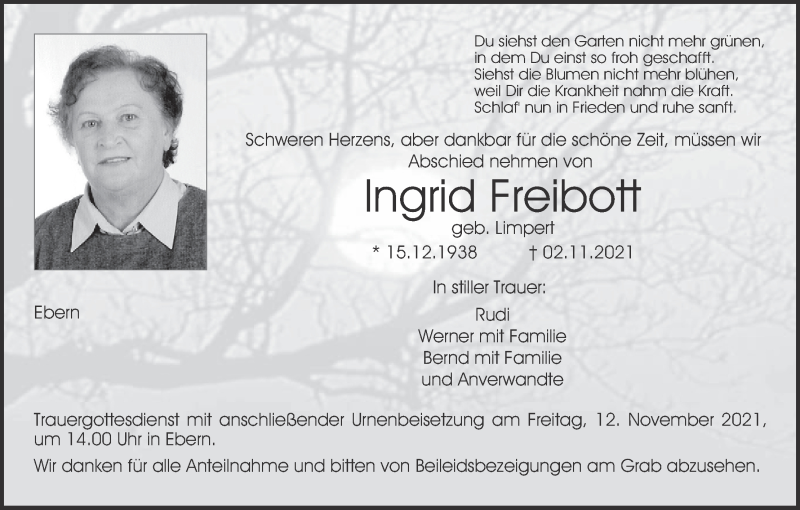 Hier finden Sie alle Traueranzeigen aus der Zeitung, die bisher für Ingrid Freibott erschienen sind. Weitere Traueranzeigen, die in der Zeitung erscheinen, werden hier ebenfalls aufgelistet