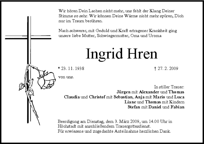 Hier finden Sie alle Traueranzeigen aus der Zeitung, die bisher für Ingrid Hren erschienen sind. Weitere Traueranzeigen, die in der Zeitung erscheinen, werden hier ebenfalls aufgelistet