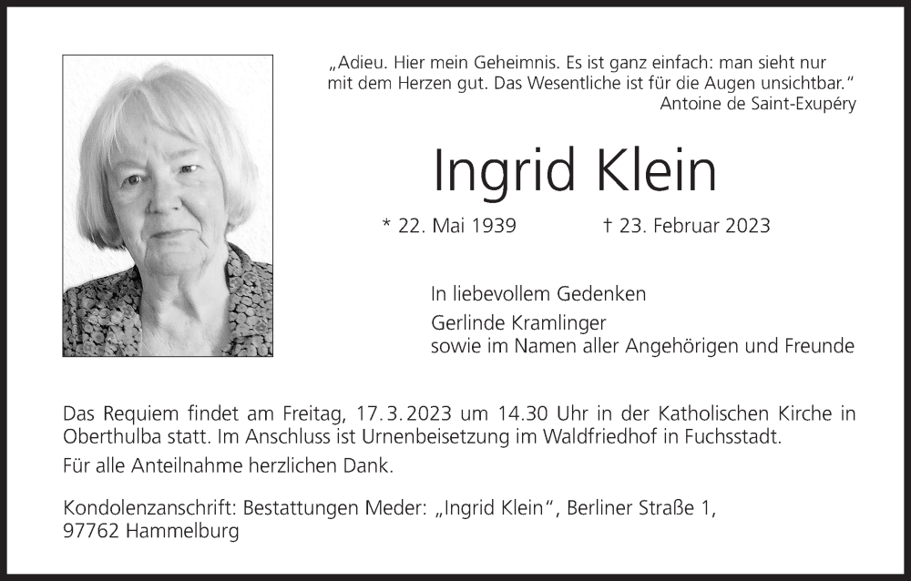 Hier finden Sie alle Traueranzeigen aus der Zeitung, die bisher für Ingrid Klein erschienen sind. Weitere Traueranzeigen, die in der Zeitung erscheinen, werden hier ebenfalls aufgelistet