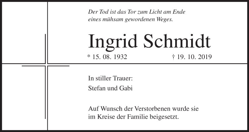 Hier finden Sie alle Traueranzeigen aus der Zeitung, die bisher für Ingrid Schmidt erschienen sind. Weitere Traueranzeigen, die in der Zeitung erscheinen, werden hier ebenfalls aufgelistet