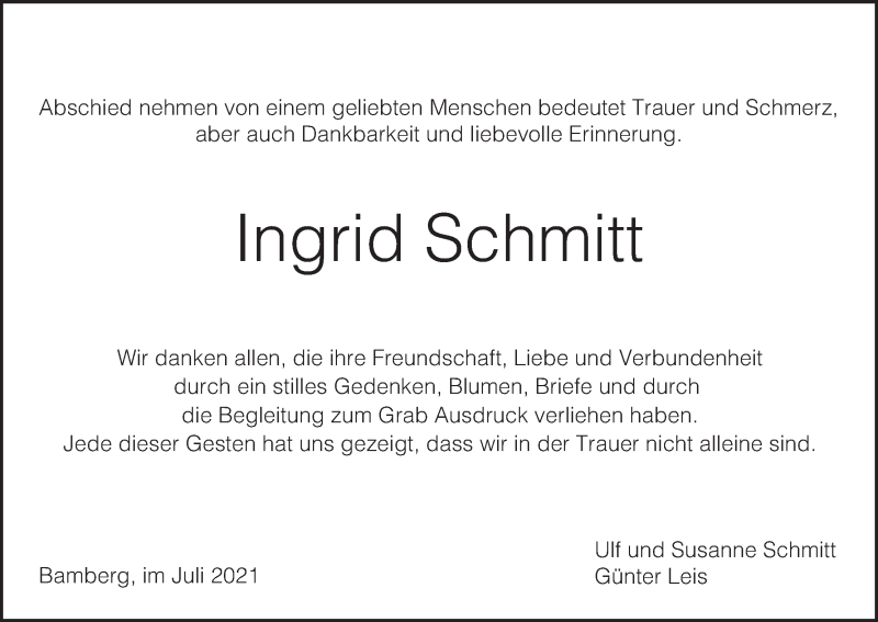 Hier finden Sie alle Traueranzeigen aus der Zeitung, die bisher für Ingrid Schmitt erschienen sind. Weitere Traueranzeigen, die in der Zeitung erscheinen, werden hier ebenfalls aufgelistet