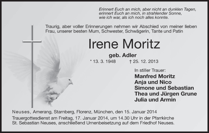 Hier finden Sie alle Traueranzeigen aus der Zeitung, die bisher für Irene Moritz erschienen sind. Weitere Traueranzeigen, die in der Zeitung erscheinen, werden hier ebenfalls aufgelistet