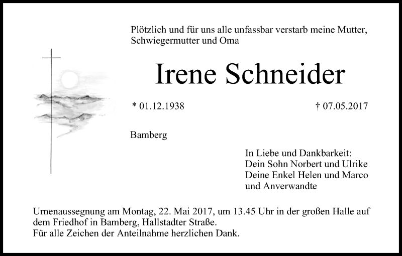 Hier finden Sie alle Traueranzeigen aus der Zeitung, die bisher für Irene Schneider erschienen sind. Weitere Traueranzeigen, die in der Zeitung erscheinen, werden hier ebenfalls aufgelistet