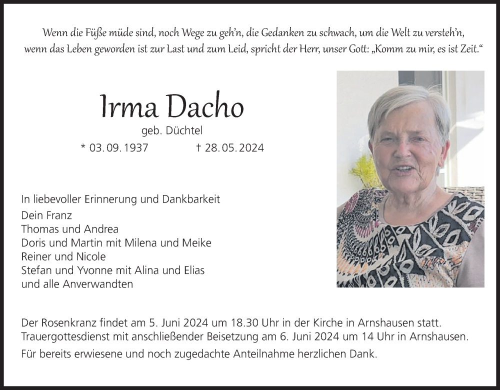 Hier finden Sie alle Traueranzeigen aus der Zeitung, die bisher für Irma Dacho erschienen sind. Weitere Traueranzeigen, die in der Zeitung erscheinen, werden hier ebenfalls aufgelistet