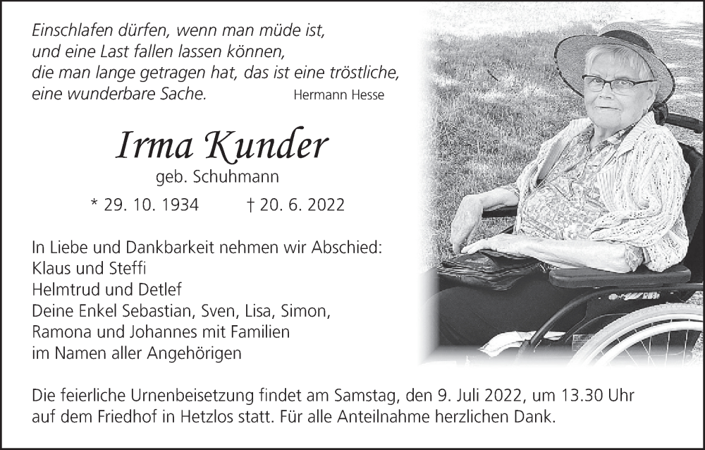 Hier finden Sie alle Traueranzeigen aus der Zeitung, die bisher für Irma Kunder erschienen sind. Weitere Traueranzeigen, die in der Zeitung erscheinen, werden hier ebenfalls aufgelistet