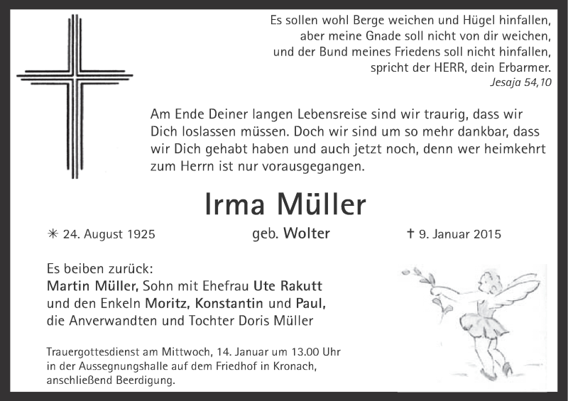 Hier finden Sie alle Traueranzeigen aus der Zeitung, die bisher für Irma Müller erschienen sind. Weitere Traueranzeigen, die in der Zeitung erscheinen, werden hier ebenfalls aufgelistet