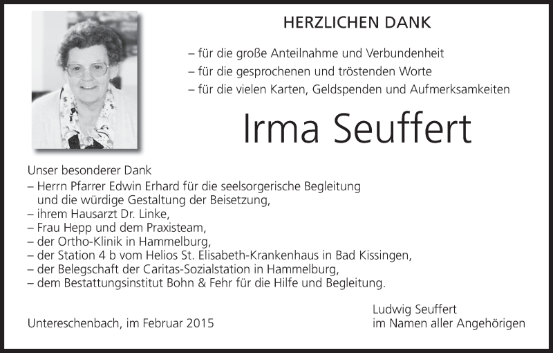 Hier finden Sie alle Traueranzeigen aus der Zeitung, die bisher für Irma Seuffert erschienen sind. Weitere Traueranzeigen, die in der Zeitung erscheinen, werden hier ebenfalls aufgelistet