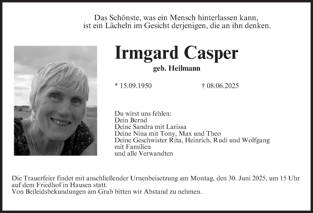Hier finden Sie alle Traueranzeigen aus der Zeitung, die bisher für Irmgard Casper erschienen sind. Weitere Traueranzeigen, die in der Zeitung erscheinen, werden hier ebenfalls aufgelistet