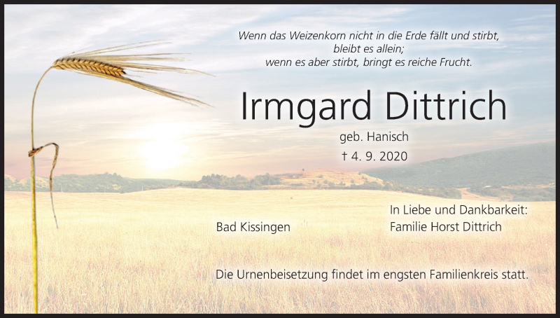 Hier finden Sie alle Traueranzeigen aus der Zeitung, die bisher für Irmgard Dittrich erschienen sind. Weitere Traueranzeigen, die in der Zeitung erscheinen, werden hier ebenfalls aufgelistet