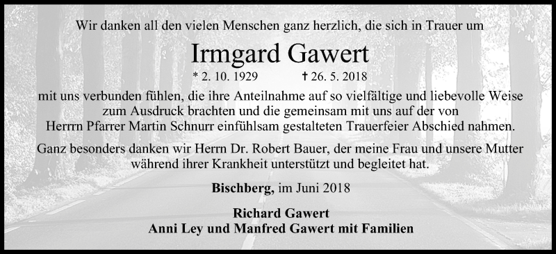 Hier finden Sie alle Traueranzeigen aus der Zeitung, die bisher für Irmgard Gawert erschienen sind. Weitere Traueranzeigen, die in der Zeitung erscheinen, werden hier ebenfalls aufgelistet