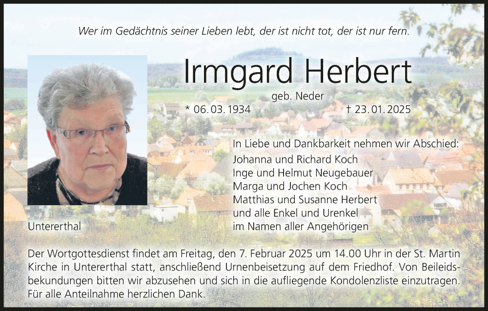 Hier finden Sie alle Traueranzeigen aus der Zeitung, die bisher für Irmgard Herbert erschienen sind. Weitere Traueranzeigen, die in der Zeitung erscheinen, werden hier ebenfalls aufgelistet