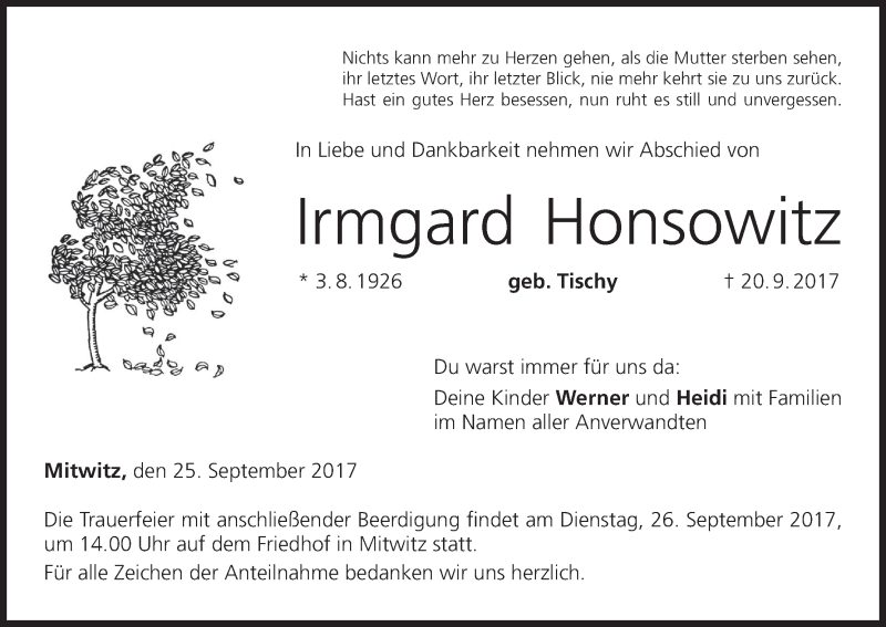 Hier finden Sie alle Traueranzeigen aus der Zeitung, die bisher für Irmgard Honsowitz erschienen sind. Weitere Traueranzeigen, die in der Zeitung erscheinen, werden hier ebenfalls aufgelistet