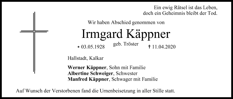 Hier finden Sie alle Traueranzeigen aus der Zeitung, die bisher für Irmgard Käppner erschienen sind. Weitere Traueranzeigen, die in der Zeitung erscheinen, werden hier ebenfalls aufgelistet