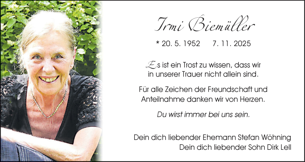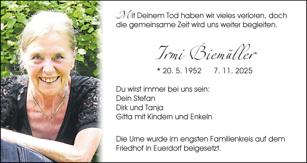Hier finden Sie alle Traueranzeigen aus der Zeitung, die bisher für Irmi Biemüller erschienen sind. Weitere Traueranzeigen, die in der Zeitung erscheinen, werden hier ebenfalls aufgelistet