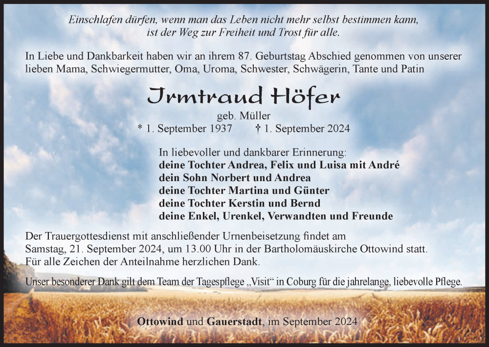 Hier finden Sie alle Traueranzeigen aus der Zeitung, die bisher für Irmtraud Höfer erschienen sind. Weitere Traueranzeigen, die in der Zeitung erscheinen, werden hier ebenfalls aufgelistet