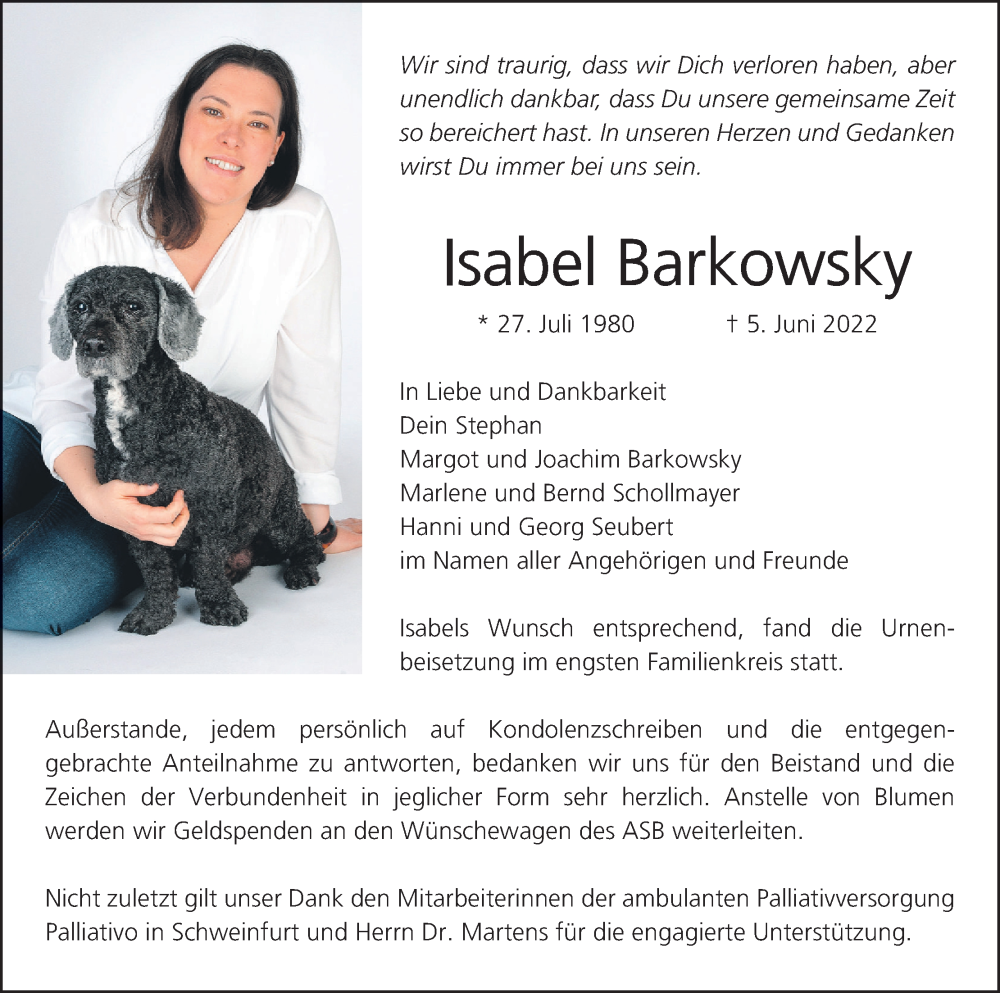 Hier finden Sie alle Traueranzeigen aus der Zeitung, die bisher für Isabel Barkowsky erschienen sind. Weitere Traueranzeigen, die in der Zeitung erscheinen, werden hier ebenfalls aufgelistet