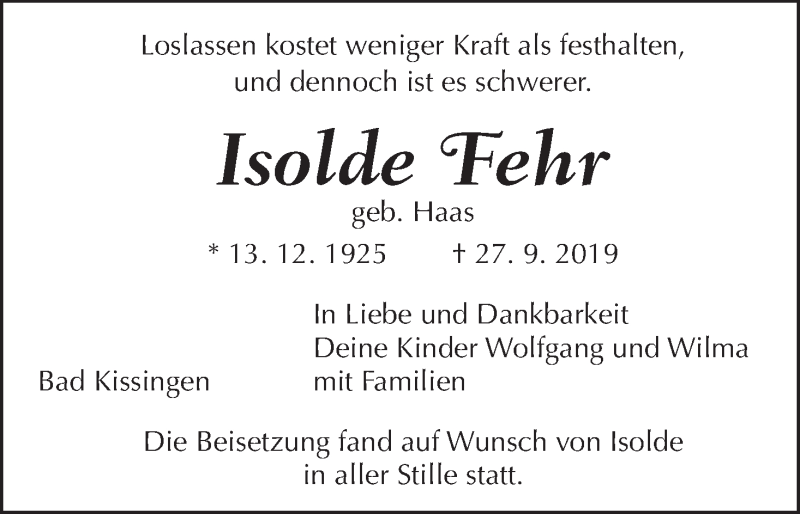 Hier finden Sie alle Traueranzeigen aus der Zeitung, die bisher für Isolde Fehr erschienen sind. Weitere Traueranzeigen, die in der Zeitung erscheinen, werden hier ebenfalls aufgelistet