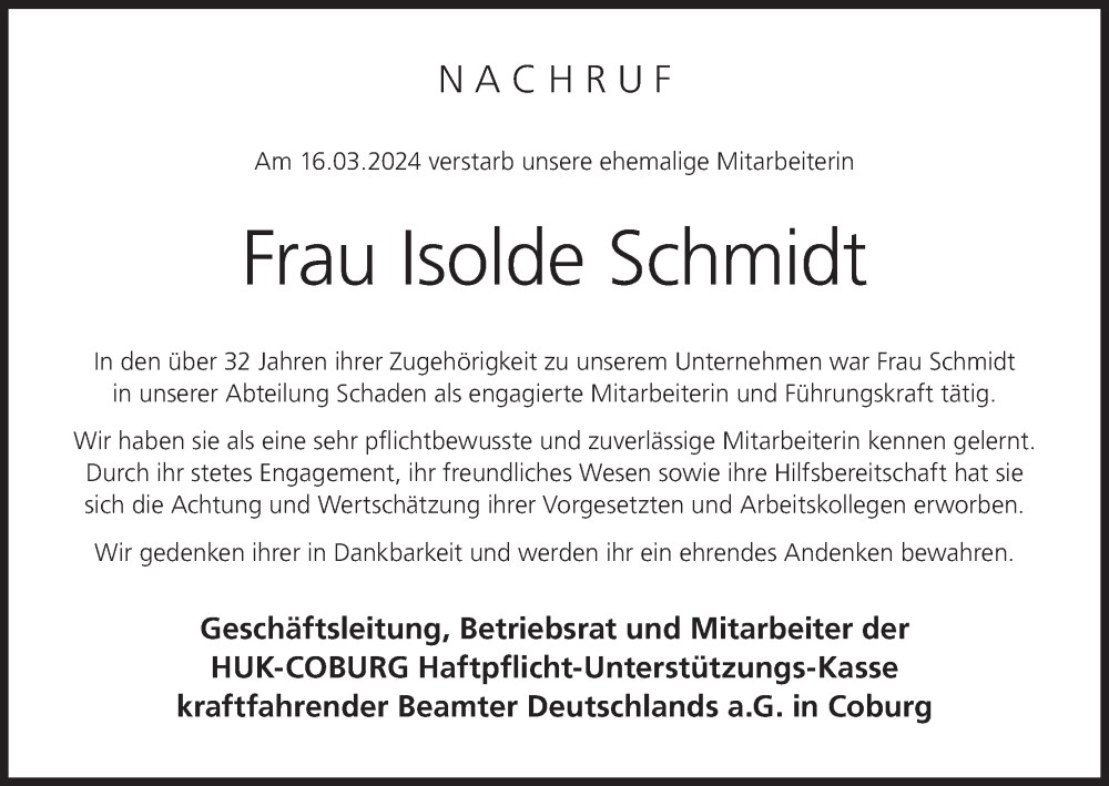 Hier finden Sie alle Traueranzeigen aus der Zeitung, die bisher für Isolde Schmidt erschienen sind. Weitere Traueranzeigen, die in der Zeitung erscheinen, werden hier ebenfalls aufgelistet