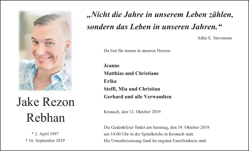 Hier finden Sie alle Traueranzeigen aus der Zeitung, die bisher für Jake Rezon Rebhan erschienen sind. Weitere Traueranzeigen, die in der Zeitung erscheinen, werden hier ebenfalls aufgelistet