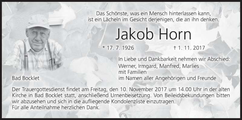 Hier finden Sie alle Traueranzeigen aus der Zeitung, die bisher für Jakob Horn erschienen sind. Weitere Traueranzeigen, die in der Zeitung erscheinen, werden hier ebenfalls aufgelistet