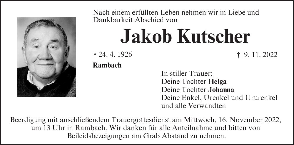Hier finden Sie alle Traueranzeigen aus der Zeitung, die bisher für Jakob Kutscher erschienen sind. Weitere Traueranzeigen, die in der Zeitung erscheinen, werden hier ebenfalls aufgelistet