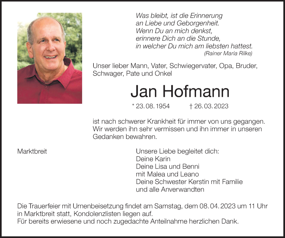 Hier finden Sie alle Traueranzeigen aus der Zeitung, die bisher für Jan Hofmann erschienen sind. Weitere Traueranzeigen, die in der Zeitung erscheinen, werden hier ebenfalls aufgelistet