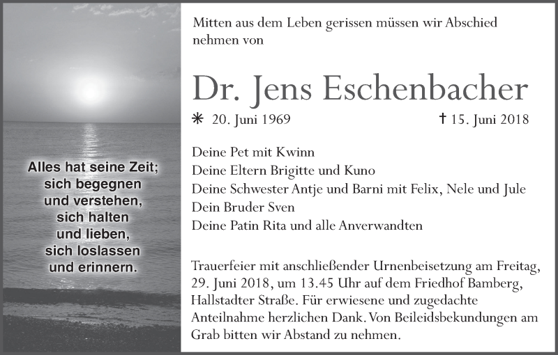 Hier finden Sie alle Traueranzeigen aus der Zeitung, die bisher für Jens Eschenbacher erschienen sind. Weitere Traueranzeigen, die in der Zeitung erscheinen, werden hier ebenfalls aufgelistet