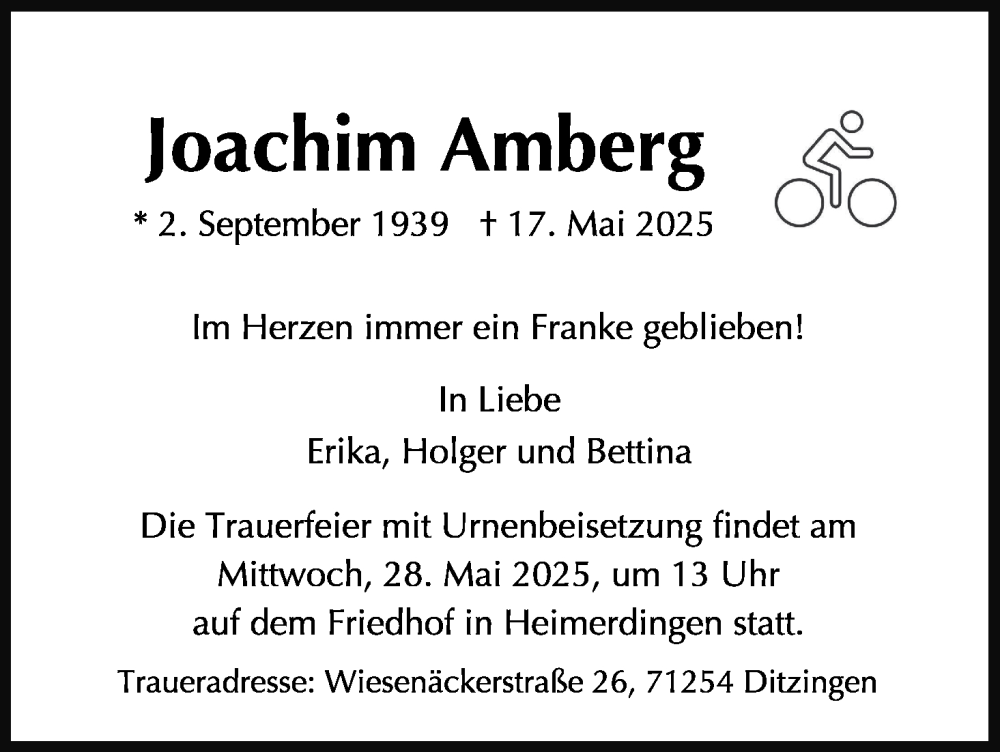 Hier finden Sie alle Traueranzeigen aus der Zeitung, die bisher für Joachim Amberg erschienen sind. Weitere Traueranzeigen, die in der Zeitung erscheinen, werden hier ebenfalls aufgelistet