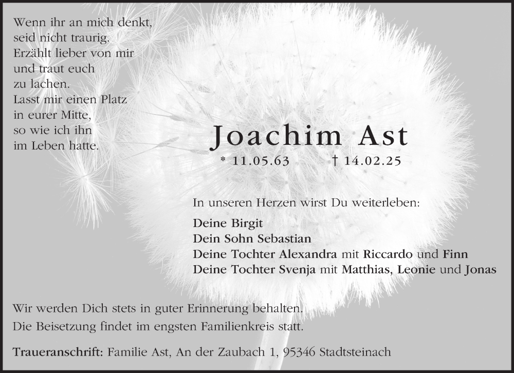 Hier finden Sie alle Traueranzeigen aus der Zeitung, die bisher für Joachim Ast erschienen sind. Weitere Traueranzeigen, die in der Zeitung erscheinen, werden hier ebenfalls aufgelistet