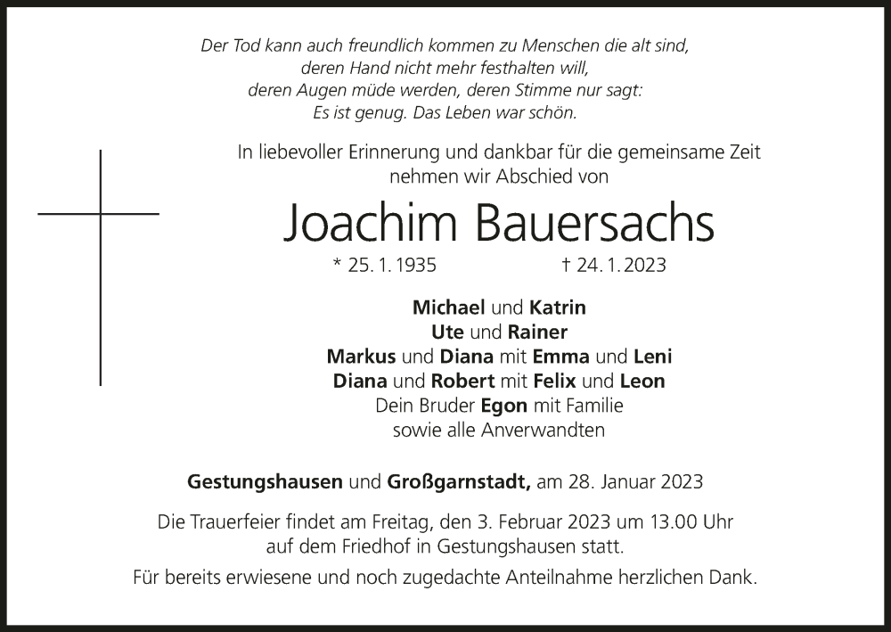 Hier finden Sie alle Traueranzeigen aus der Zeitung, die bisher für Joachim Bauersachs erschienen sind. Weitere Traueranzeigen, die in der Zeitung erscheinen, werden hier ebenfalls aufgelistet