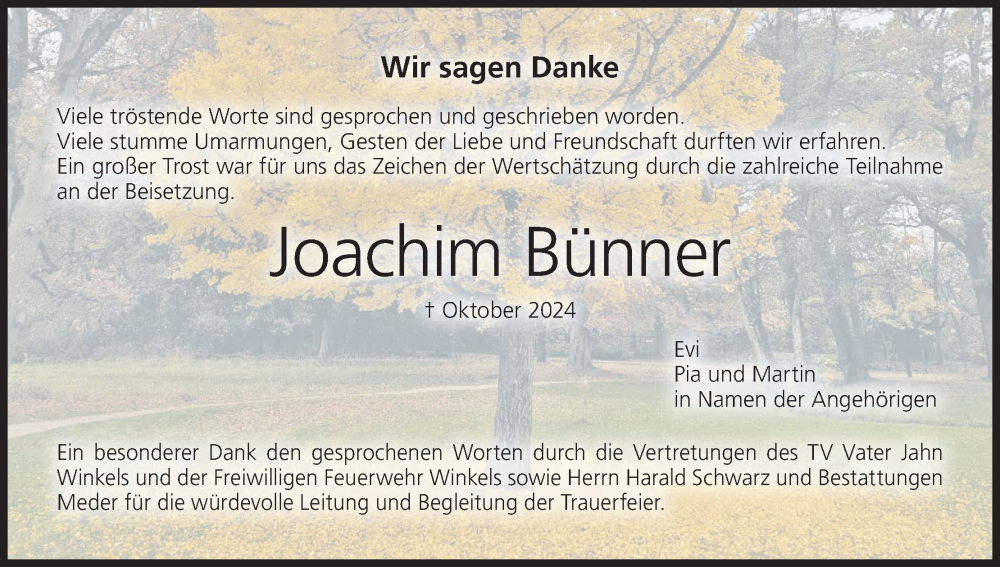 Hier finden Sie alle Traueranzeigen aus der Zeitung, die bisher für Joachim Bünner erschienen sind. Weitere Traueranzeigen, die in der Zeitung erscheinen, werden hier ebenfalls aufgelistet