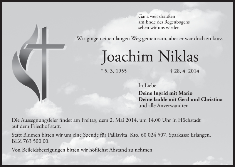 Hier finden Sie alle Traueranzeigen aus der Zeitung, die bisher für Joachim Niklas erschienen sind. Weitere Traueranzeigen, die in der Zeitung erscheinen, werden hier ebenfalls aufgelistet