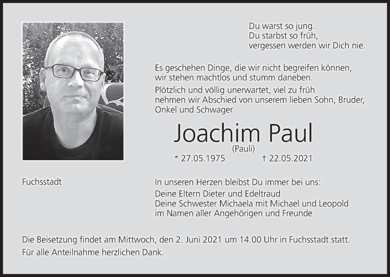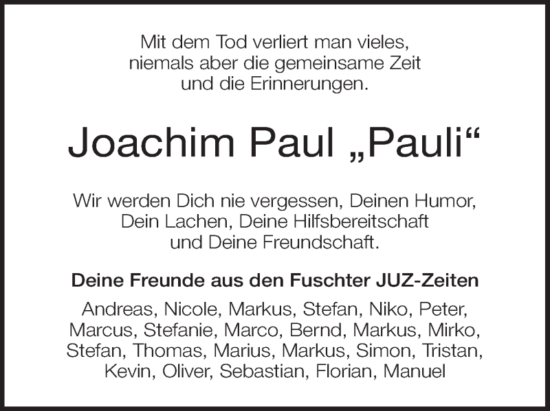 Hier finden Sie alle Traueranzeigen aus der Zeitung, die bisher für Joachim Paul erschienen sind. Weitere Traueranzeigen, die in der Zeitung erscheinen, werden hier ebenfalls aufgelistet