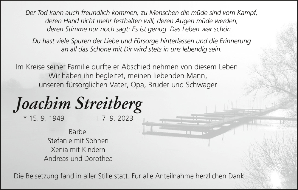 Hier finden Sie alle Traueranzeigen aus der Zeitung, die bisher für Joachim Streitberg erschienen sind. Weitere Traueranzeigen, die in der Zeitung erscheinen, werden hier ebenfalls aufgelistet