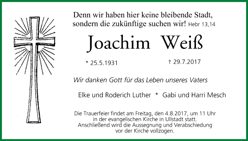 Hier finden Sie alle Traueranzeigen aus der Zeitung, die bisher für Joachim Weiß erschienen sind. Weitere Traueranzeigen, die in der Zeitung erscheinen, werden hier ebenfalls aufgelistet