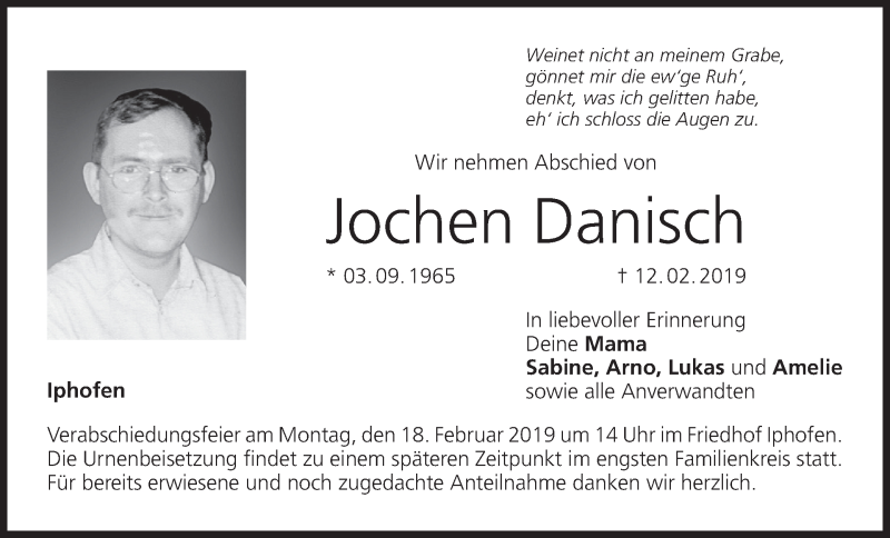 Hier finden Sie alle Traueranzeigen aus der Zeitung, die bisher für Jochen Danisch erschienen sind. Weitere Traueranzeigen, die in der Zeitung erscheinen, werden hier ebenfalls aufgelistet