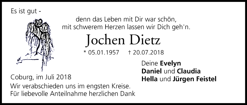 Hier finden Sie alle Traueranzeigen aus der Zeitung, die bisher für Jochen Dietz erschienen sind. Weitere Traueranzeigen, die in der Zeitung erscheinen, werden hier ebenfalls aufgelistet