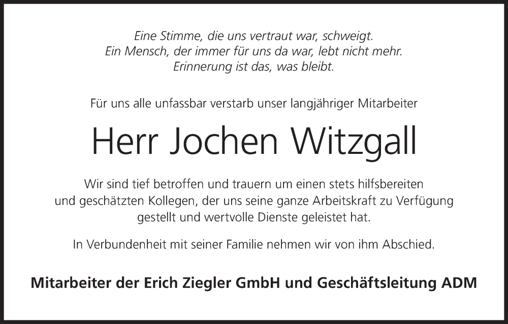 Hier finden Sie alle Traueranzeigen aus der Zeitung, die bisher für Jochen Witzgall erschienen sind. Weitere Traueranzeigen, die in der Zeitung erscheinen, werden hier ebenfalls aufgelistet