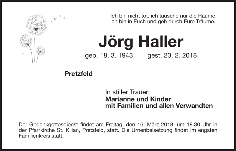 Hier finden Sie alle Traueranzeigen aus der Zeitung, die bisher für Jörg Haller erschienen sind. Weitere Traueranzeigen, die in der Zeitung erscheinen, werden hier ebenfalls aufgelistet