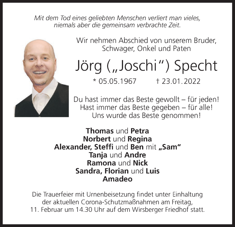 Hier finden Sie alle Traueranzeigen aus der Zeitung, die bisher für Jörg Specht erschienen sind. Weitere Traueranzeigen, die in der Zeitung erscheinen, werden hier ebenfalls aufgelistet