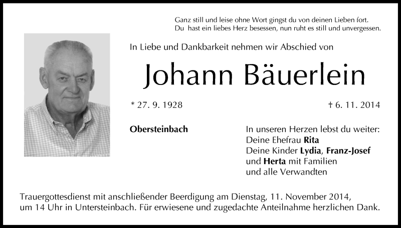 Hier finden Sie alle Traueranzeigen aus der Zeitung, die bisher für Johann Bäuerlein erschienen sind. Weitere Traueranzeigen, die in der Zeitung erscheinen, werden hier ebenfalls aufgelistet