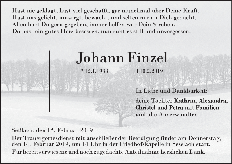 Hier finden Sie alle Traueranzeigen aus der Zeitung, die bisher für Johann Finzel erschienen sind. Weitere Traueranzeigen, die in der Zeitung erscheinen, werden hier ebenfalls aufgelistet