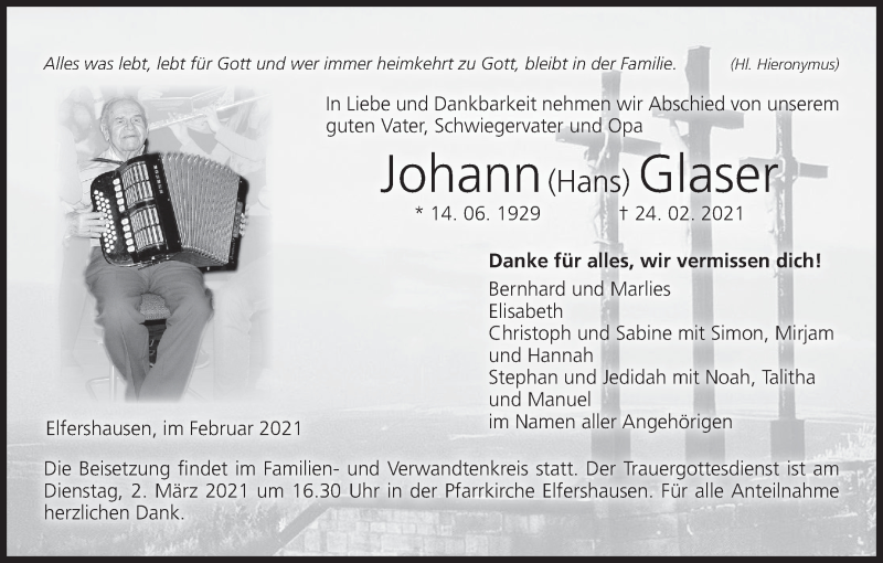 Hier finden Sie alle Traueranzeigen aus der Zeitung, die bisher für Johann Glaser erschienen sind. Weitere Traueranzeigen, die in der Zeitung erscheinen, werden hier ebenfalls aufgelistet