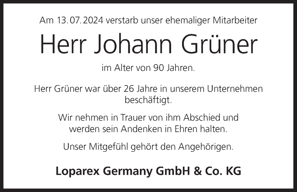 Hier finden Sie alle Traueranzeigen aus der Zeitung, die bisher für Johann Grüner erschienen sind. Weitere Traueranzeigen, die in der Zeitung erscheinen, werden hier ebenfalls aufgelistet