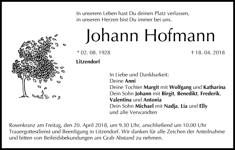 Hier finden Sie alle Traueranzeigen aus der Zeitung, die bisher für Johann Hofmann erschienen sind. Weitere Traueranzeigen, die in der Zeitung erscheinen, werden hier ebenfalls aufgelistet