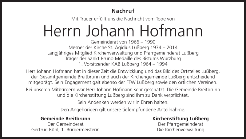 Hier finden Sie alle Traueranzeigen aus der Zeitung, die bisher für Johann Hofmann erschienen sind. Weitere Traueranzeigen, die in der Zeitung erscheinen, werden hier ebenfalls aufgelistet