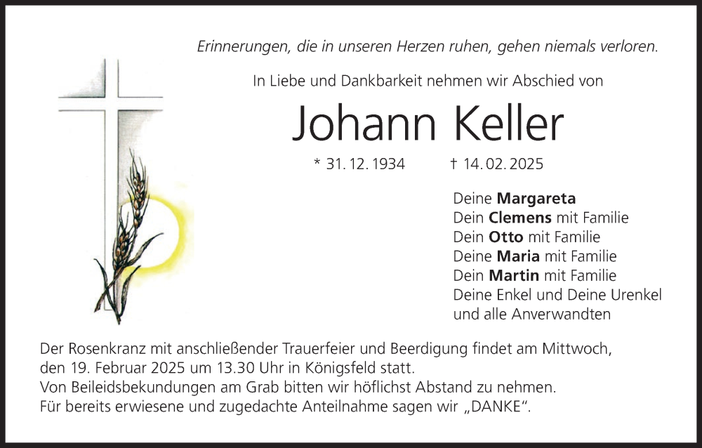 Hier finden Sie alle Traueranzeigen aus der Zeitung, die bisher für Johann Keller erschienen sind. Weitere Traueranzeigen, die in der Zeitung erscheinen, werden hier ebenfalls aufgelistet