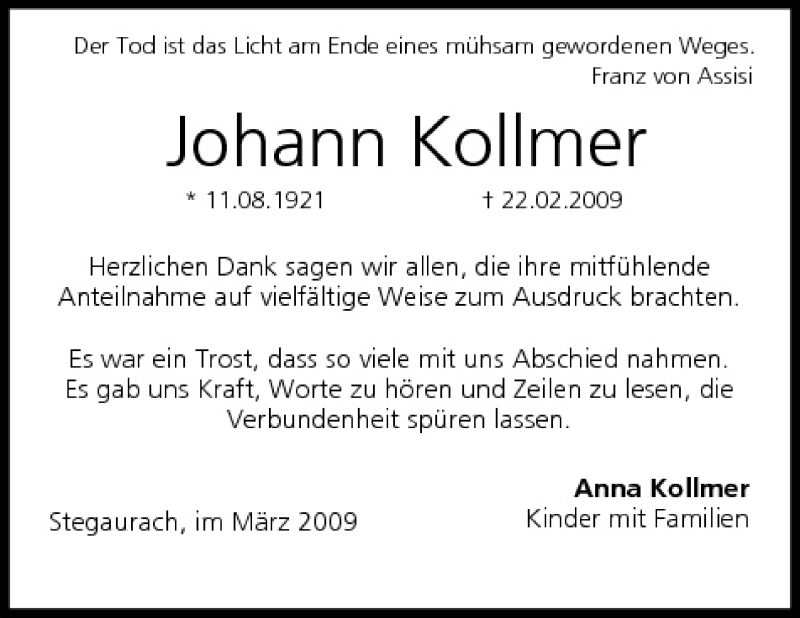 Hier finden Sie alle Traueranzeigen aus der Zeitung, die bisher für Johann Kollmer erschienen sind. Weitere Traueranzeigen, die in der Zeitung erscheinen, werden hier ebenfalls aufgelistet