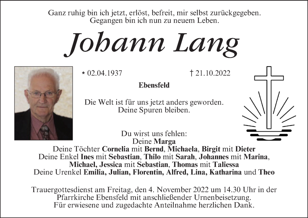 Hier finden Sie alle Traueranzeigen aus der Zeitung, die bisher für Johann Lang erschienen sind. Weitere Traueranzeigen, die in der Zeitung erscheinen, werden hier ebenfalls aufgelistet