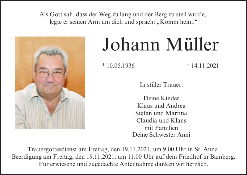 Hier finden Sie alle Traueranzeigen aus der Zeitung, die bisher für Johann Müller erschienen sind. Weitere Traueranzeigen, die in der Zeitung erscheinen, werden hier ebenfalls aufgelistet
